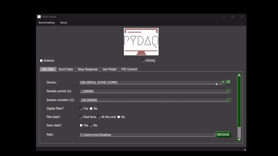 After this command, the following screen will show up, where the user should select the Arduino option and go to the Get Data tab, to be able to define parameters and start to acquire data.