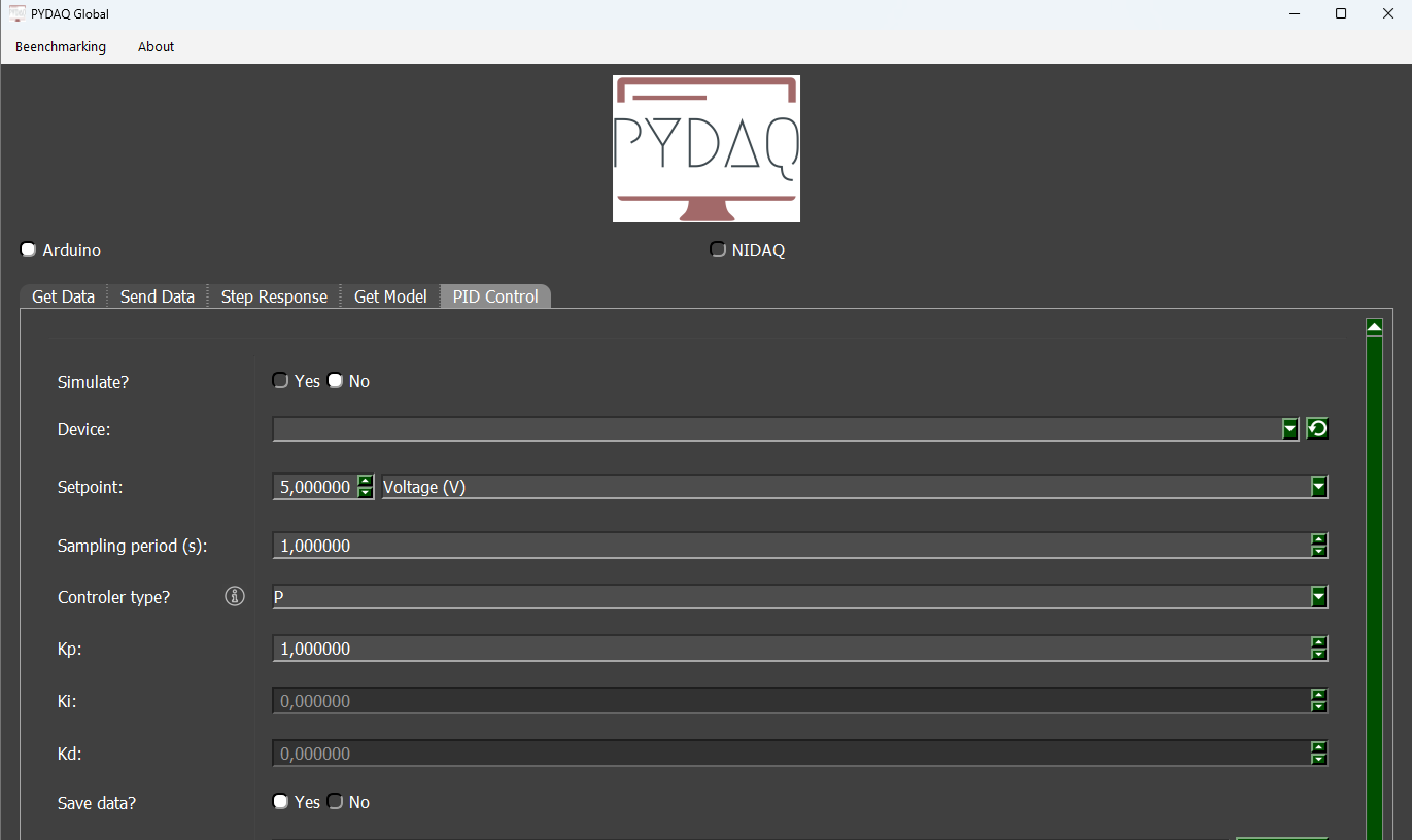 If you enable the Simulate option, the software will not require a physical device. Instead, you can input the transfer function or system equation, and PYDAQ will simulate its response using the defined controller parameters.