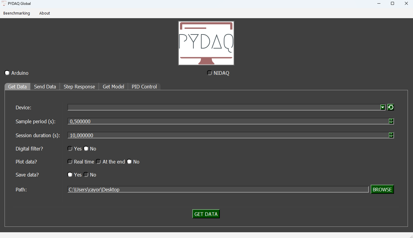 After this command, the following screen will show up, where the user should select the Arduino option and go to the Get Data tab, to be able to define parameters and start to acquire data.