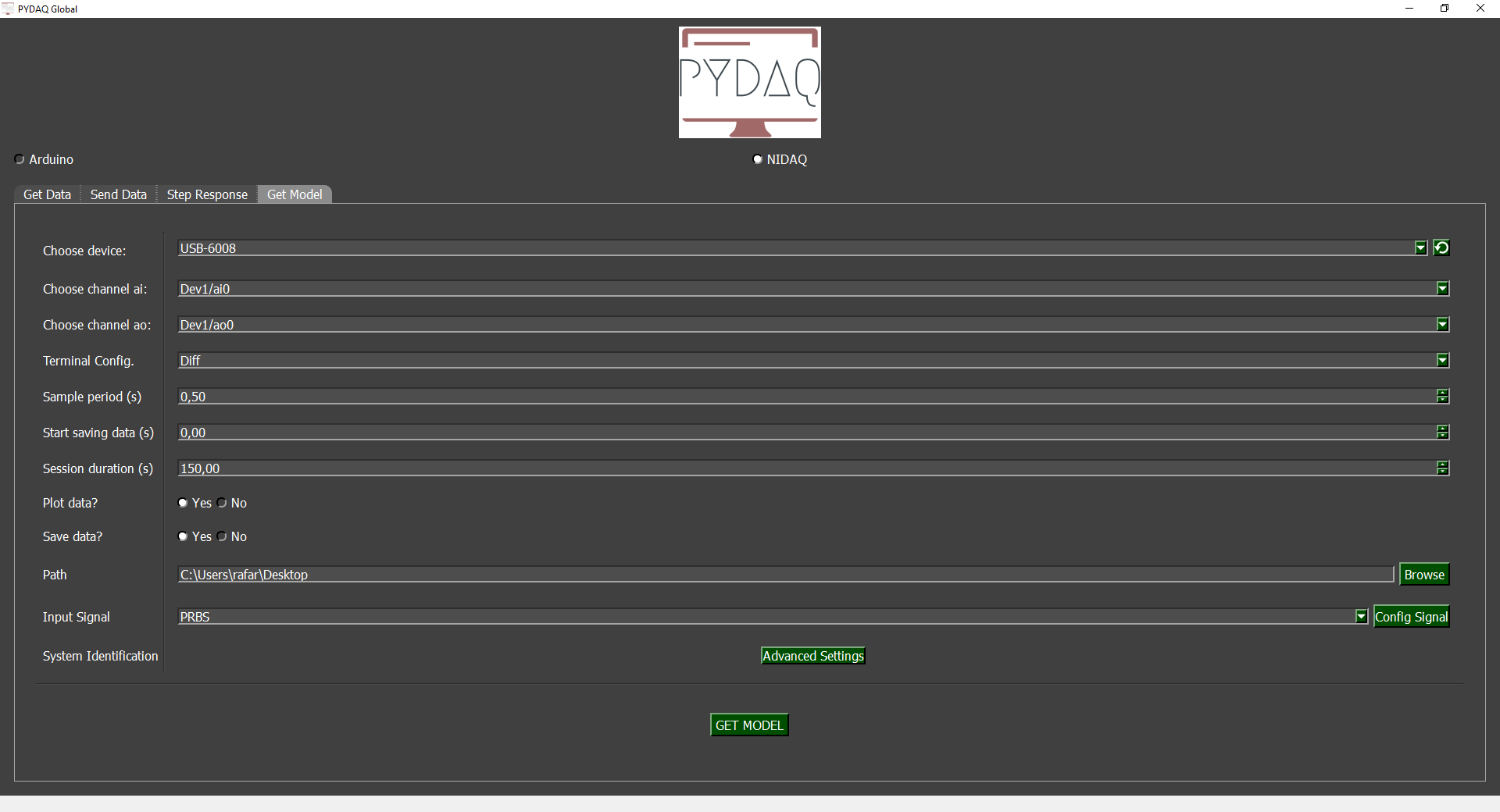 After this command, the following screen will show up. In "Get Model" screen the user is able to define parameters and start the experiment to adquire the model.