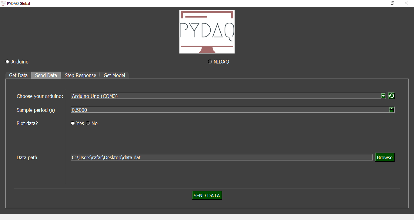 After this command, the graphical user interface screen will show up, where the user should select the Arduino option and go to the Send Data tab, to be able to define parameters and start to send the data.
