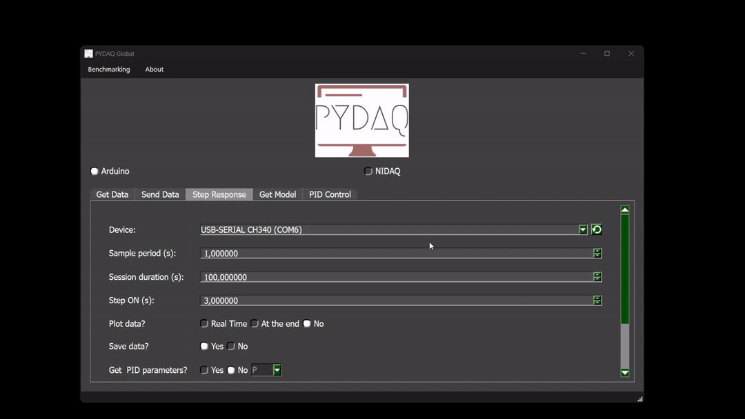 After this command, the graphical user interface screen will show up, where the user should select the Arduino option and go to the Step Response tab, to be able to define parameters and start to acquire data.