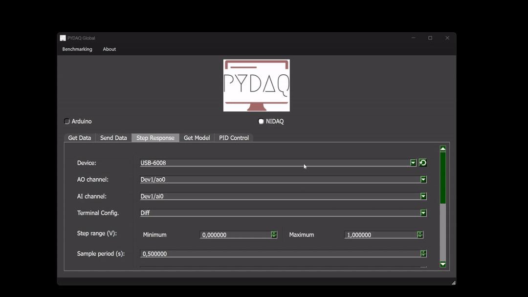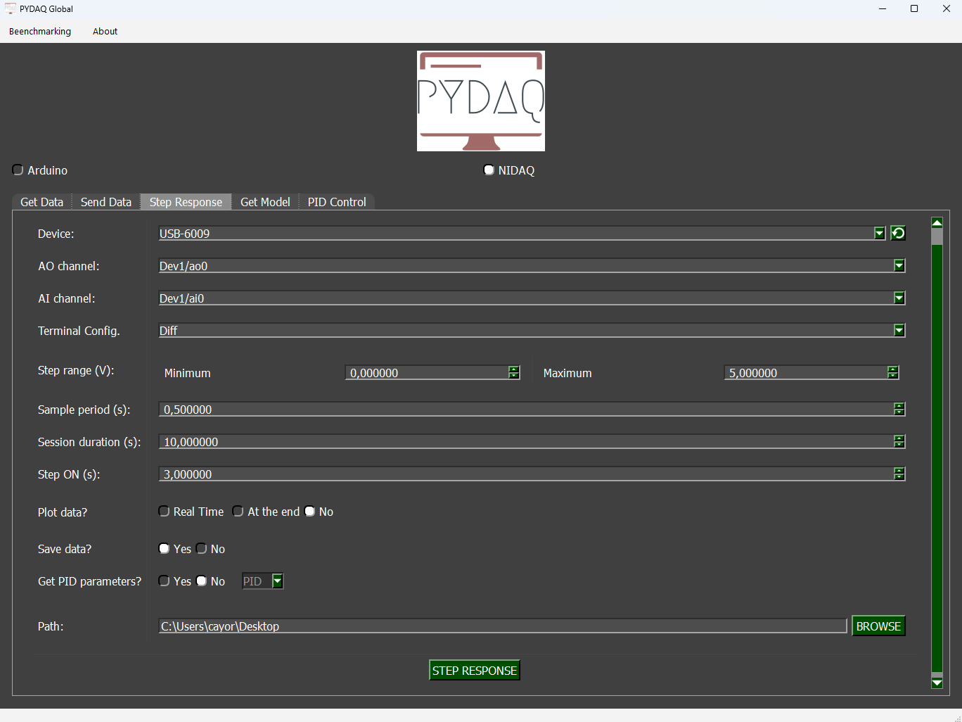 After this command, the graphical user interface screen will show up, where the user should select the NIDAQ option and go to the Step Response tab, to be able to define parameters and start to acquire data.